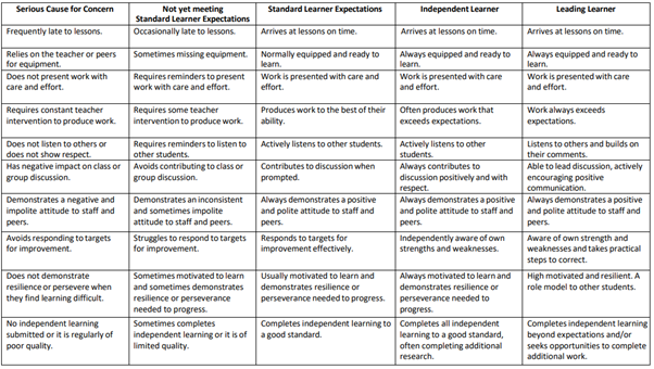 We use five categories to describe Attitude to Learning, based on our Standard Learner Expectations, which outline the behaviours and habits we expect from all students to support their progress. Some students may exceed these expectations and be recognised as Independent or Leading learners. These grades are designed to give you a clear indication of how your child is engaging with their learning in lessons – please see the grid below for more information.